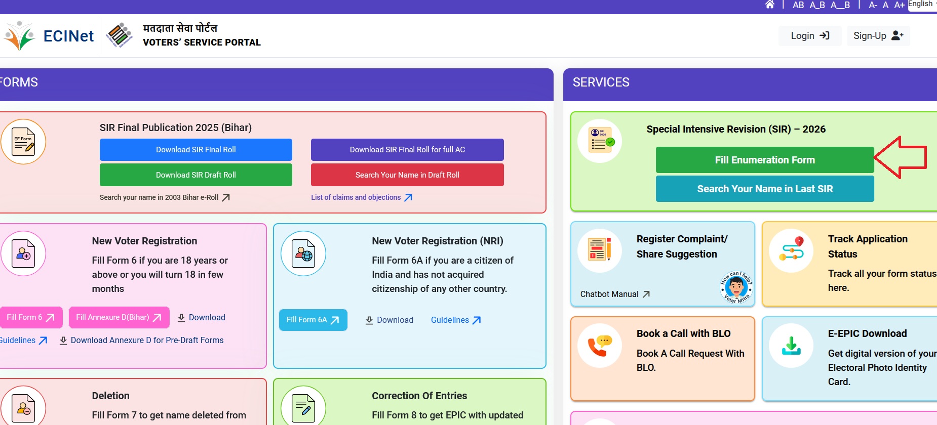 Step-2 : Click on “Fill Enumeration Form’ button under Special Intensive Revision (SIR) – 2026 services