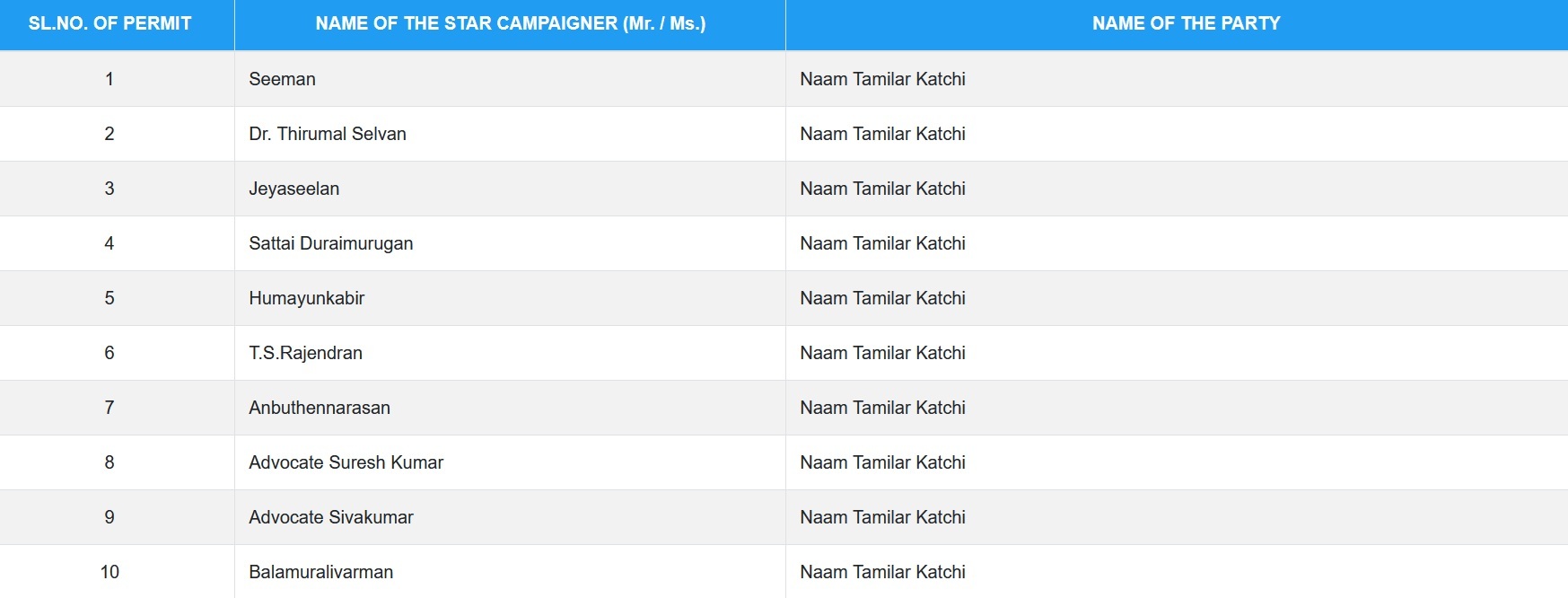 Tamil Nadu Legislative Assembly (TNLA) Election 2026, details of Star Campaigner passes issued to. You can view the full list of Star Campaigners of TNLA 2026 in the link given above.