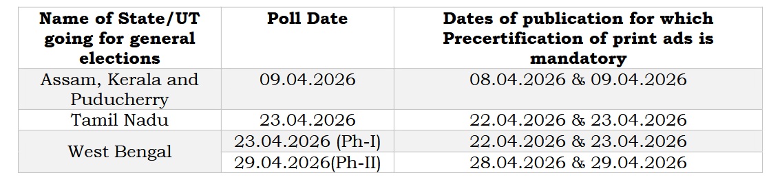 4. Accordingly, precertification of ads in poll-bound states/UT are necessary as per the schedule given below: