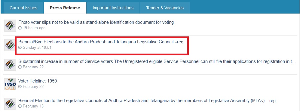 Now, the Commission has decided to hold above mentioned Biennial Election to Andhra Pradesh and Telangana Legislative Councils and bye election to the Andhra Pradesh Legislative Council from Visakhapatnam Local Authorities’ Constituency, in accordance with the following schedule