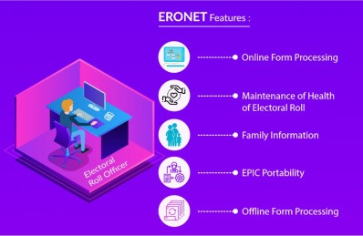 ERONET standardised forms processing, standard database schema, and a standard template for eroll printing. It automates the process of electoral roll management starting from elector registration, field verification of electors, decision support system for Electoral registration officers and for providing extensive integrated value-added services.